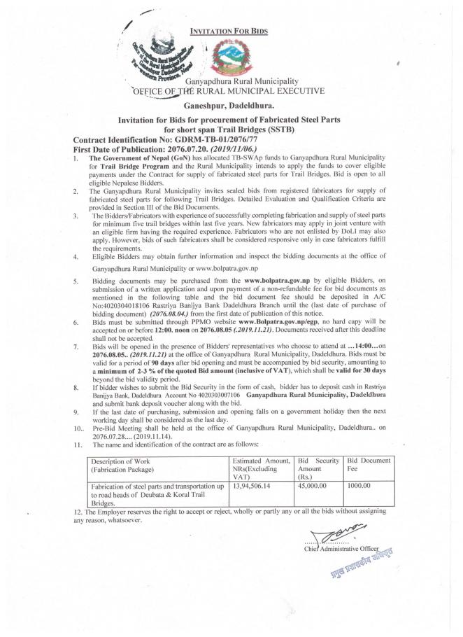 » Invitation for bids for procurement of fabricated steel parts for short span frail bridges