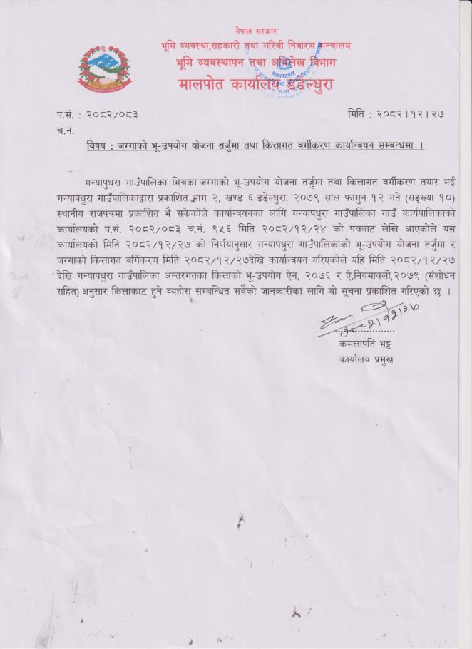 जग्गाको भू-उपयोग योजना तर्जुमा तथा कित्तागत वर्गिकरण कार्यान्वयन भएको सूचना
